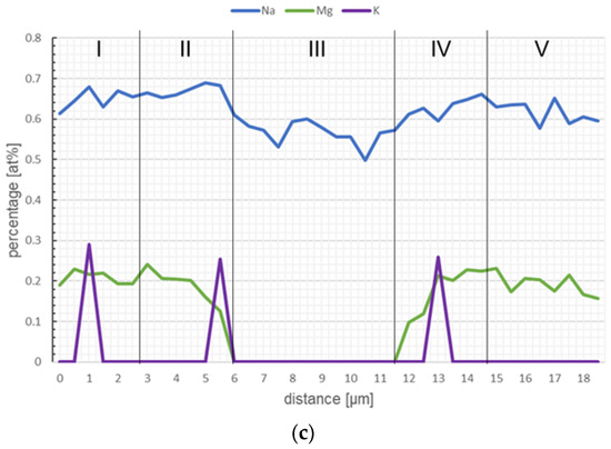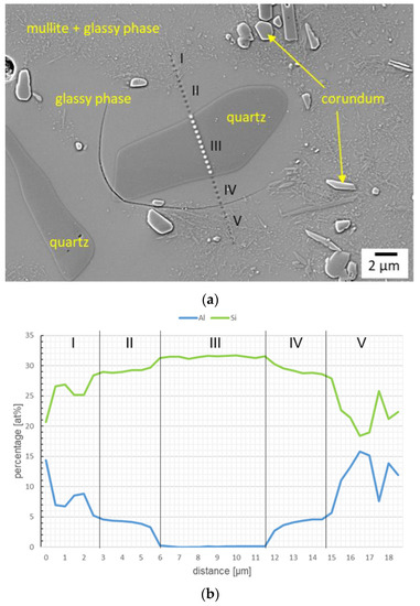 Figure 2 shows the position of a line scan through a quartz grain and the surrounding matrix. Based on the line scan in Figure 2b,c. the assignment of quartz, the glassy phase, mullite and of corundum can be made. Based on the observed content of the different cations, the quartz grain can be easily located (region III). The aluminum content in this region is 0 at.%. A glassy phase can be detected in the range II and IV. The silicon content shows a lower value compared to the quartz particle. However, the aluminum content is still low (appr. 4.3 at.%). Figure 2 gives the content of the additional cations. It reveals in area of the glassy phase Mg, Na and K in low concentrations. The concentration of the alkali and earth alkali cations in the glass is low and varies from position to position. The sodium content in the quartz seems to be an artifact of the preparation since the solubility of the sodium in quartz is very low. In range I to V, mullite and glassy phase are present, which can be recognized on the one hand by the thin needle shape of the mullite in Figure 2 and on the other hand by the slight increase in aluminum and the decrease in silicon content compared to the ranges with glassy phases and quartz grains, respectively.