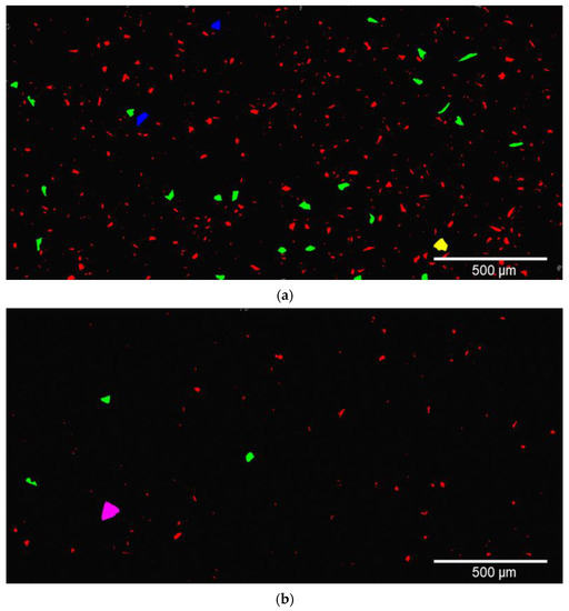 EDS representation silicon oxide (a) sample “high quartz” hq-1, (b) sample “low quartz” lq-1—classification: red: (0–600) µm2, light green: (600–1200) µm2, dark blue: (1200–1800) µm2, yellow: (1800–2400) µm2, turquoise: (2400–3000) µm2, brown: (3000–3600) µm2, pink: (3600–4200) µm2, gray: outside the area of consideration.
