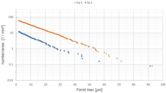 Particle size distribution of the sample hq-1 and lq-1 determined by quantitative image analysis of EDS images (area: 12.5 mm2).