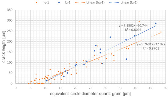 Figure 6 shows the dependence of the crack length on the grain size (equivalent circle diameter) of the quartz grains. It shows that the crack length changes linearly with the grain size. However, the graph does not go through the coordinate origin. Nearly all small quartz grains do not show cracks around the grains. This indicates that there is a critical quartz grain size below which no cracking occurs. It has to be taken into account that the measured grain size in the cross-section is smaller than the three-dimensional grain size. This could explain the fact that also very few of the smaller grains showed some cracks. To determine the critical grain size, a linear fit was used (Figure 6)