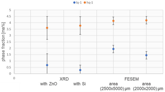 Figure 7 and Table 4 show a comparison of the results of the quartz content measured by XRD and image analysis. The comparison shows good agreement between the two methods. However, the deviations are slightly higher for the material with low quartz content (lq-1). This could relate to statistical reasons. Moreover, for the low quartz content, the error of determination by XRD is in the same order as the determined content.