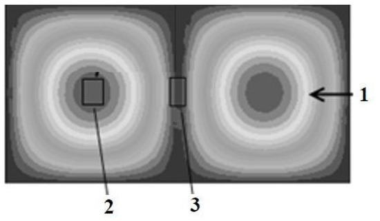 The distribution of fields in the resonator chamber of the microwave heating installation 1—Direction of supplied microwave energy, 2—maxima of electric field strength, 3—maxima of magnetic field strength.