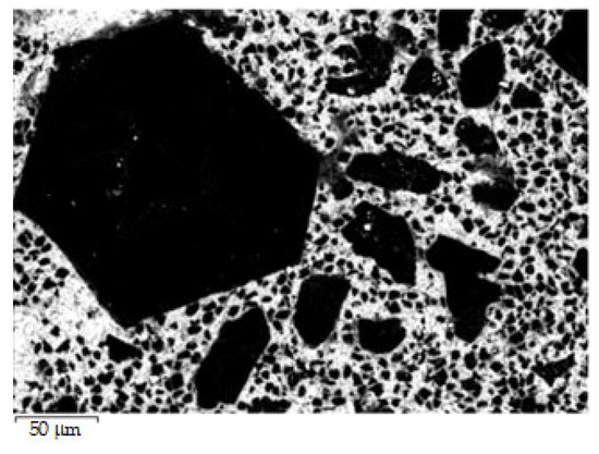 Evidently, the properties of such composites are evidently determined by the ratio between the phases (diamond, SiC, Si, graphite), as well as by the porosity. In turn, the resulting phase composition and porosity depend on the initial diamond powder dispersion. The prediction of the optimal particle size distribution of the diamond matrix before siliconization is impossible. Apparently, the elasticity modulus of the composite grows with the increase of the resulting diamond content. However, the absence or insufficient content of silicon carbide prevents the diamond grains being retained in the material. The use of coarse diamond grains with higher mechanical properties compared to fine diamond grains can be expected to improve the mechanical properties of the composites. On the other hand, a matrix comprising coarse diamond grains contains relatively large voids, causing a high porosity. Large and well-faceted single crystals usually feature a reduced reactivity. Consequently, more residual unreacted silicon will remain after their siliconization. The optimization of the granulometric composition of powders intended for sintering single-phase ceramics should be based on simple geometric factors including the selection of the grain size providing the maximum density; e.g., using the Fuller method. However, in this case, molten silicon not only fills the spaces between the diamond grains but also reacts with diamond, resulting in a decrease of diamond particle size and formation of an additional SiC phase. The result of this process is unpredictable in view of silicon’s different rates of reaction with diamonds of different dispersion. Thus, despite the fact that the dispersion of the initial diamond powders is decisive in achieving the best performances properties of the composite, the choice of granulometric composition is based on a certain research experience. For comparison, the properties of similar diamond-SiC-Si composites obtained without high-pressure application are summarized in Table 1.