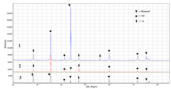 XRD spectra of diamond-SiC-Si composite surfaces with relatively high contents of (1) diamond (sample 7, bottom), (2) SiC (sample 19, top), and (3) Si (sample 8, top).
