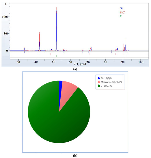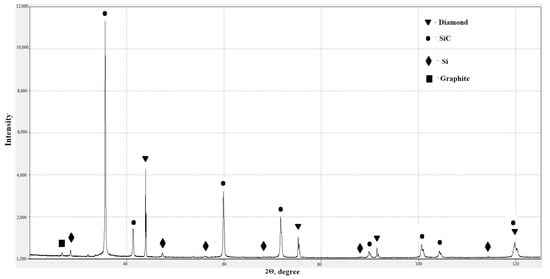 The necessity of mass transfer at sintering results in transformations of metastable phases; i.e., diamond conversion into graphite at temperatures above 800 °C in an oxidizing environment or above 1600 °C in an inert environment [3,4,5,6]. Consequently, such materials with high diamond content can be obtained by high-pressure, high-temperature (HPHT) sintering technique [7,8], reaction sintering [9,10,11], or electrospark plasma sintering [12]. Particularly in reaction sintering, a diamond billet and non-diamond components are impregnated with liquid silicon at 1450–1650 °C in an inert atmosphere or in vacuum. The impregnation results in the formation of a composite comprising diamond and SiC, as well as the residual silicon deteriorating mechanical performances and corrosion resistance of the composites [13]. In addition to the considered reaction infiltration, these materials can be obtained using a reaction infiltration of silica vapor in vacuum [14,15].
