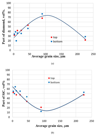 The parts of other phases in the composite, i.e., remaining diamond and silicon carbide formed by reaction (1), passed through an extremum depending on the initial size of the diamond grains in the blank sample (Figure 6).