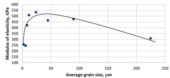 Interestingly, this extremum corresponded to a diamond size of 80–100 µm and did not coincide with the extreme values of physical properties (density and modulus of elasticity) observed in the region of 20–28 µm.