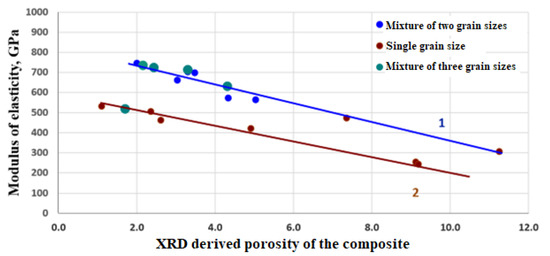 In compositions containing diamond grains of two different sizes, the maximum content of diamond in couple with minimum content of silicon carbide and silicon phases were observed for mixtures with the ratio of 50:50. The highest elasticity modulus was also shifted relating to the maximum of the diamond content, probably due to the contribution of porosity to the mechanical characteristics of the material. Generally, there was a positive correlation between the elasticity modulus and the part of the diamond phase in the composite (Figure 8). However, the composite porosity had a greater influence on the modulus of elasticity. Obviously, an increase in the elastic modulus corresponded to a decrease in porosity of the composite, but in this case the experimental data were arranged along two almost parallel correlation lines (Figure 8). The analysis of this phenomenon showed that data for matrices comprising a mixture of two and three grain sizes with a diamond grain size of at least 10/80 µm and a matrix of narrow grain sizes of more than 80 µm fell on one straight line of correlation. The second straight line of correlation included the results for all narrow grain sizes less than 80 µm and polydisperse mixtures containing micropowders with a grain size of 3/2 µm.