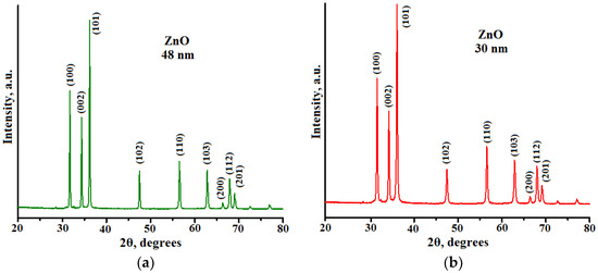 Furthermore, the difference in powders’ electronic structures and structural defects in their lattices can affect their photocatalytic activities. The authors of [42,43] found that the presence of structural defects in ZnO crystals decreases their photocatalytic activity. On the contrary, the enhancement of photocatalytic properties with increased amounts of structural defects in ZnO nanorods was described in [8]. This disagreement can be to the different ratios of volume to surface structural defects in ZnO materials synthesized and studied in [42,43,45].