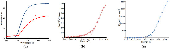 (a) Reflection spectra of powders 1 (curve 1) and 2 (curve 2). The dependencies (αhν)2 = f (hν) obtained for powders 1 (b) and 2 (c).