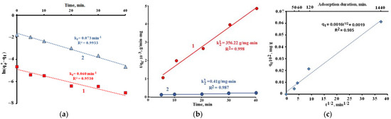 Dependencies ln(qe − qt) = f(t) (a), t/qt = f(t) (b) and qt = f(t1/2) (c) for CSB adsorption on the surface of powders 1 and 2.