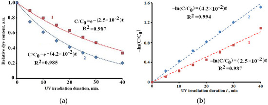 (a) Kinetic dependencies of CSB photodecomposition in solutions under UV irradiation in the presence of ceramic powders 1 (curve 1) and 2 (curve 2); (b) dependencies – ln(C/C0) = f(t) for CSB photodecomposition in solutions under UV irradiation in the presence of ceramic powders 1 (curve 1) and 2 (curve 2).