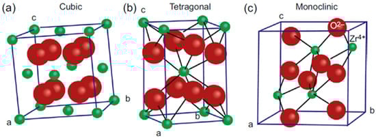 Crystal cells of pure zirconia phases (red—oxygen, green—zirconium): (a) cubic, (b) tetragonal, (c) monoclinic. Reproduced with permission from Ref. [19], Copyright 2019 Elsevier.