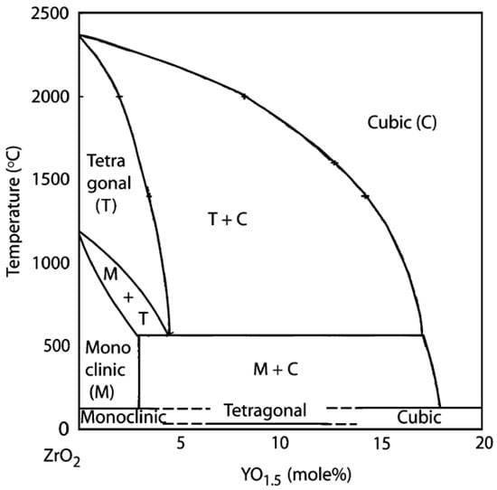 Phase transformation from tetragonal to monoclinic occurs at a temperature between 850 and 1000 °C after the processing of pure zirconia and during the post-sintering cooling period [17]. The phase transformation due to polymorphism is associated with high volume expansion (~5–7 vol%), promoting the risk of brittle failure or the apparition of cracks and flaws in the polycrystalline ceramic [22]. Therefore, the manufacture of pure zirconia is unfeasible due to the high risk of catastrophic failure. To retain the tetragonal form at room temperature after sintering, typical oxide dopants are added to pure zirconia, such as yttria (Y2O3), calcium oxide (CaO), and ceria (CeO2). However, yttria is the most commonly employed stabilizing oxide, as lower amounts are needed [23]. The phase diagram of ZrO2/Y2O3 presented in Figure 2 illustrates the stability regions of different phases according to the amount of yttria added to stabilize pure zirconia. It is shown that the reverse phase transition from monoclinic to tetragonal occurring at approximately 1170 °C decreased to <600 °C with the addition of ~4.8 mol% of yttria. The coexistence of a multiphase structure (cubic + tetragonal, cubic + monoclinic, cubic, and tetragonal + monoclinic) is observed in the solid solution regions separated by the single phases. Hence, partially stabilized zirconia (PSZ) with cubic and tetragonal structures as major phases and monoclinic precipitates in small amounts can be produced [24]. These materials are stable at temperatures between 600 and 2000 °C with an yttria content in the range of 3–8 mol% and exhibit exceptional resistance to high thermal shock [21,25,26].