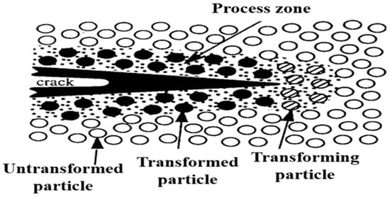 The stress-induced transformation from tetragonal to monoclinic mostly occurs in TZPs and PSZ ceramics, where the tetragonal phase is in its metastable state at room temperature. This concept, based on a change in the grain shape accompanied by a volume increase, was discovered for the first time in the mid-1970s by Garvie et al. [31] and led to the considerable fracture toughness enhancement of zirconia composites, as pointed out earlier [25]. This mechanism is known as transformation toughening in zirconia and involves a microcracked process zone at the crack tip, as shown schematically in Figure 3. As a result of crack propagation, a stress field is generated around the crack tip and contributes to the phase transformation of the surrounding particles, which occurs at a speed close to that of sound propagation in solids [21]. This phenomenon leads, in turn, to the formation of a transformed process zone constrained by the neighboring particles of the matrix.