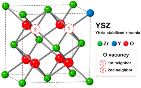 Schematic structure of fluorite-like cubic YSZ. Reproduced from Ref. [43] under the Creative Common license CC BY.
