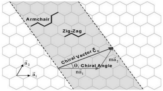 CNTs can be classified either as armchair, zig-zag, or chiral tubes according to the pair of integers (n, m) in the chiral vector relation (Figure 6). In armchair and zig-zag CNTs, the structure follows mirror symmetry along both axes (longitudinal and transverse) due to the arrangement of hexagons around the circumference. On the contrary, chiral CNTs are characterized by a non-symmetric structure; therefore, mirror symmetry is not achieved. These three different structures and enrolments of fullerene sheets to form CNTs are shown in Figure 7. Furthermore, the values of the integers (n, m) influence the optical, mechanical, and electronic properties of CNTs. CNTs are considered as semiconductors when and metallic when [10,48].