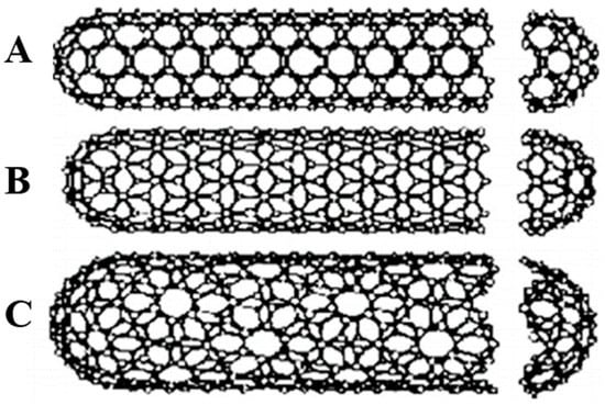 CNT structure based on chirality. The structure of CNTs is easily determined by the terminations, so-called caps or end caps: (A) armchair structure, (B) zig-zag structure, (C) chiral structure. Reproduced from Ref. [10] under the Creative Common license CC BY.