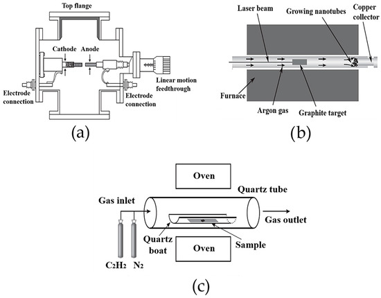 The process involves a carbon source, mainly hydrocarbons, such as acetylene, ethylene, or ethanol, and metal catalyst particles, usually cobalt, nickel, iron, or a combination of these, such as cobalt/iron or cobalt/molybdenum. The catalyst tends to decompose the carbon-containing gas in the presence of plasma irradiation or heat (600–1200 °C) and to induce the nucleation of CNTs. As a result, the free carbon atoms recombine in the form of CNTs on the substrates, some common examples of which are Ni, Si, SiO2, Cu, Cu/Ti/Si, stainless steel, or glass. Figure 8c shows the experimental set-up of the discussed methods to synthesize CNTs [46,49].