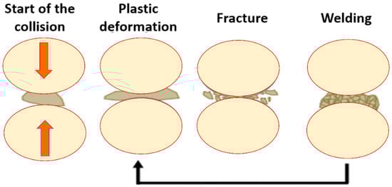 Schematic illustration of the plastic deformation, fracture, and welding of powder between balls. The black arrow shows the repetition of the three processes.