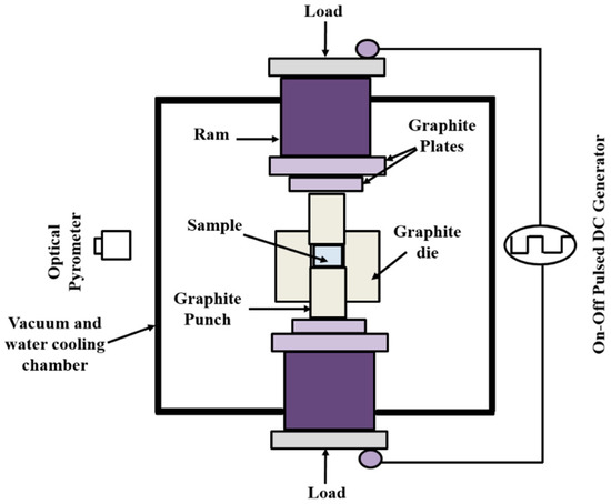 The advantages of the SPS process over other traditional sintering methods, such as hot pressing and hot-isostatic pressing (HIP), are the ability to consolidate high-temperature ceramics, metals, and composites in few minutes (1000 °C/min), resulting in reduced duration and energy costs [60,62], and high thermal efficiency due to the absence of any heating elements. SPS heats by passing a highly pulsed direct current through a graphite die and the sample to be sintered. A typical SPS configuration [63] is illustrated in Figure 10. The powder is inserted into a conductive graphite die in a water-cooled SPS chamber. During sintering, a uniaxial pressure is applied to the die by an upper and a lower punch. Then, a pulsated current is directed through the punch and the die for thermal heating under vacuum or protective gas evacuated and filled through the water-cooled chamber. The sintering temperature can be adjusted to a high value, namely 2400 °C, using either thermocouples or axial/radial pyrometers. The SPS process enables more uniform Joule heating conditions, especially for conducting samples. Furthermore, the current largely enhances the mass transport mechanism through electro-migration, which contributes to obtaining dense samples with finer grain structures, despite the low sintering times and temperatures [64,65,66].