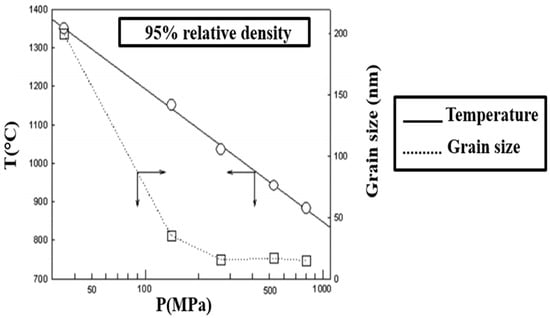 Influence of sintering pressure on the temperature required for 95% theoretical density (TD) in zirconia with corresponding grain sizes. Adapted with permission from Ref. [65], Copyright 2006 Elsevier.