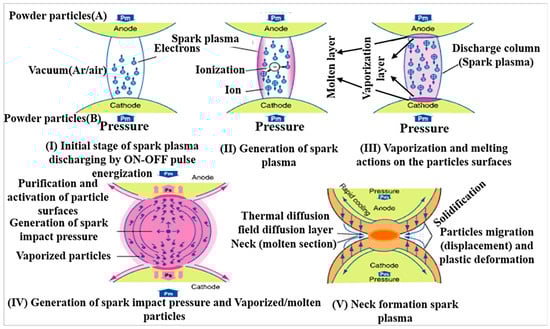 The appearance of spark discharges caused by the alternative switching on and off of the DC creates hot regions where the impurities located between particles are melted and vaporized. This process has been ascribed mainly to the generation of weak plasma through the powder sintered under a pulsed current and causes a phenomenon referred to as “necking”, leading to the high purification and joining of the densified particles. The detailed steps of the process are shown in Figure 12. However, the concept of plasma still remains not adequately understood without providing a direct justification for its existence. Thus, plasma generation represents an important objective of the struggle to establish an implicit understanding of the process.