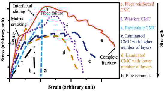 The strength of engineering materials is commonly measured using tensile tests, where external forces tend to elongate specimens. Typical stress–strain curves comparing the tensile behavior of pure ceramics with different types of reinforced CMCs are depicted in Figure 13. In pure ceramics (illustrated by the black dotted curve), brittle fractures generally arise before the occurrence of plastic deformation. In fact, in pure ceramic materials, the binding orbitals of electrons are localized around the corresponding ion cores, restricting the movement of electrons. As a result, very high energy is required to generate the movement of dislocations and, therefore, make plastic deformation possible [72,75]. Single-phase ceramics also exhibit poor toughness compared with ductile materials, like metals.