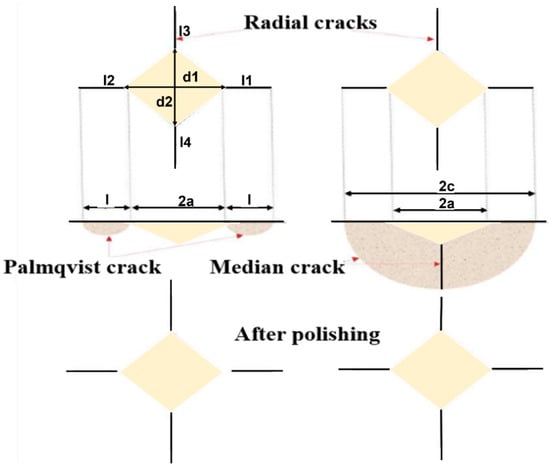 - Hagan, J.T.; Swain, M.V. The origin of median and lateral cracks around plastic indents in brittle materials. J. Phys. D Appl. Phys. 1978, 11, 2091–2102. [Google Scholar] [CrossRef]