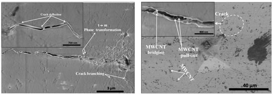 Yttria-stabilized ZrO2 possesses the advantage of phase transformation from tetragonal to monoclinic under applied stress. This mechanism is usually referred to as transformation toughening in zirconia and occurs as the volume expansion associated with the tetragonal-to-monoclinic transformation produces a stress intensity decrease at the crack tip, thus yielding a dissipation of the energy of the propagating crack. Cracks become self-stopping as, in order to allow crack propagation, both the energy barrier required for phase transformation and that associated with the volume expansion of the transformed material have to be overcome [2,3]. However, monophasic and even stabilized ZrO2 materials still exhibit brittle behavior, which constitutes a major issue [15]. To overcome this drawback, several attempts have been made to further improve the fracture behavior of ZrO2, for example, by introducing a second-phase material, while preserving all the other advantages of the matrix. In this regard, multi-walled carbon nanotube (MWCNT)-reinforced ZrO2 composites are attracting growing interest owing to their crack self-healing ability and the possibility to tailor the desired nano-structural properties. Therefore, to completely benefit from their outstanding properties, a deep understanding of the material’s behavior across the different length scales is required. Although great effort and progress have been made over the past ten years in the investigation of zirconia-based composites, only a few new material systems and novel processing techniques have been proposed. The high-energy ball milling process has been assessed for successfully synthesizing a wide range of nano-structured ceramic powders, including ZrO2. The easy operating principle uses the solid-state reaction at a temperature close to room temperature and affords low cost with an effective preparation process [16]. On the other hand, spark plasma sintering (SPS) has been emphasized by a large number of researchers to show minimal damage to CNTs and high efficiency in sintering nanostructured ceramic-based materials [9]. In this paper, a detailed investigation into the micro-structural features of zirconia composites and CNTs separately, along with presenting the most recently advanced techniques to synthesize zirconia-based composites, such as SPS and high-energy ball milling, is provided. Furthermore, this paper reviews the historical evolution of the most advanced techniques used to test the mechanical properties of ceramic matrix composites, such as hardness, strength, and indentation fracture toughness (IFT).