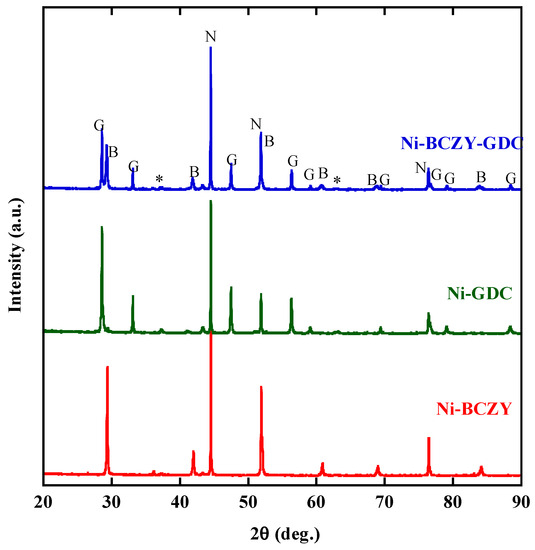 X-ray diffractograms of the Ni–BaCe0.4Zr0.4Y0.2O3−δ (BCZY), Ni–BCZY–Gd0.1Ce0.9Ox (GDC), and Ni–BCY–GDC disks after firing at 1450 °C followed by the H2 reduction at 800 °C for 2 h. The XRD peaks marked by N, B and G are attributed to those of Ni, BCZY and GDC, respectively. Asterisks are those from the unreduced NiO component.