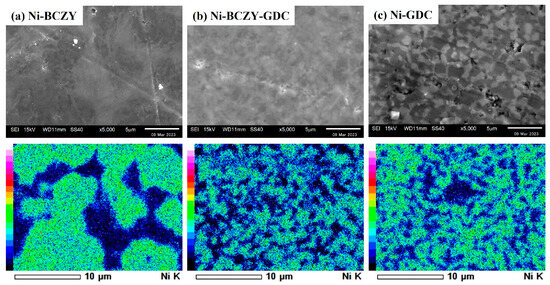 Scanning electron micrographs (left column) of the surface of the anode films sintered at 1450 °C and the corresponding elemental maps: (a) Ni–BCZY, (b) Ni–BCZY–GDC, and (c) Ni–GDC.