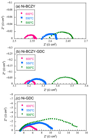 Figure 4 displays the Nyquist plots of the half-cells based on the fabricated anode films on a BCZY electrolyte substrate in a three-terminal configuration. Each plot had an ohmic component and a flattened arc; the flattened arcs likely consisted of overlapping arc components. Since the separation of the arc components was unclear, the entire arc components were evaluated as the electrode resistance. The ohmic component on the high-frequency side, instead, was attributed to the resistance from the electrolyte and lead wires of the cell holder. The ohmic resistance was in the range of 2.5–3.5 Ω cm2 and decreased with increasing the temperature. Since the thickness of the BCZY electrolyte disk was 0.06 cm, the apparent resistivity of the ohmic components was around 41.7–58.3 Ω cm2, which is comparable with the values reported for BCZY in a wet H2 atmosphere [41]. Moreover, the resistance values of the arc component attributed to the anode resistance decreased with increasing the temperature. However, regardless of the temperature, the anode resistance followed this order: Ni–GDC > Ni–BCZY–GDC > Ni–BCZY. The anode resistance of Ni–GDC was the largest by far.