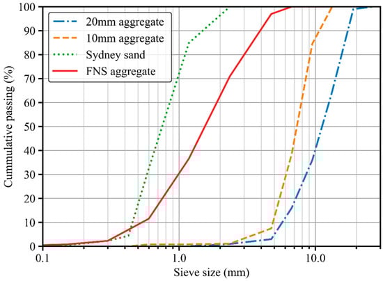 Two types of fine aggregate were used in this study: FNS aggregate as manufactured aggregate and Sydney sand as natural aggregate. The relative densities of FNS aggregate and Sydney sand are 2876 kg/m3 and 2650 kg/m3, respectively, along with a water absorption of 0.8% and 3.5%, respectively. The coarse aggregate was basalt, with maximum nominal sizes of 20 mm and 10 mm. The gradation of coarse and fine aggregates is showed in Figure 3.