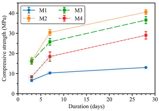 Compressive strength development of geopolymer mortar mixes from M1 to M4.
