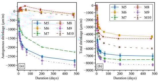 Development of geopolymer mortar shrinkage. (a) Autogenous shrinkage. (b) Total shrinkage.