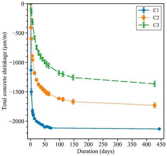The total shrinkage of the three concrete mixes up to 450 days is presented in Figure 7. Mix C1 exhibited the highest total shrinkage over the test duration. The total shrinkage of concrete C1 increased significantly during the first 70 days and then stabilised at 450 days at around −2100 μm/m. The total shrinkage in concrete C2 was considerably lower than that of C1 concrete, due to adding NaOH pellets to the mix composition. Cao et al. [41] reported higher autogenous and total shrinkage of GGBFS–FNS geopolymers when using only sodium silicate solution as an activator in comparison with the addition of NaOH to the activator. The presence of the water absorber admixture in concrete C3 led to the lowest total shrinkage among the three GGBFS–FNS concretes. The effect of the water absorber admixture was the most significant at the early age. To be specific, the total shrinkage values of the C3 concrete decreased by about 90% and 80% compared with the C1 and C2 concretes, respectively, after 1 day of drying. After 6 days of drying, the water absorber admixture reduced the total shrinkage of mix C3 by 80% and 65% in comparison with the C1 and C2 concretes, respectively. Providing that the mix design of the C2 and C3 concretes are similar, along with the shrinkage results in Section 4.3, the water absorber admixture is very efficient in decreasing the autogenous and total shrinkage in GGBFS–FNS geopolymers.