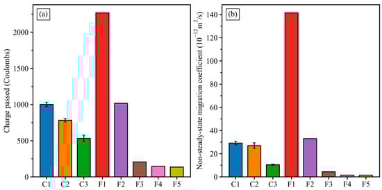 Charge passed from modified-RCPT 10 V (a) and migration coefficients from CMT (b) of geopolymer concretes.