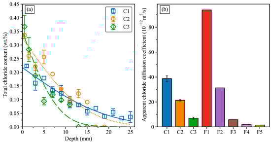 (a) The variation of total chloride content in GGBFS–FNS geopolymer concretes. (b) Apparent chloride diffusion coefficient of geopolymer concretes.