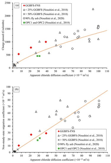 A performance-based specification has been proposed to establish the correlation between RCPT, CMT and chloride bulk diffusion tests for geopolymer concretes using various precursor materials [18,35]. Figure 10 presents the correlations including the chloride test results of the GGBFS–FNS concretes. Figure 10a shows the correlation between the modified-RCPT 10 V and the bulk diffusion test, whilst Figure 10b shows the correlation between CMT and the bulk diffusion test. The relationship observed among the three chloride tests for GGBFS–FNS geopolymers was well aligned with other geopolymer concretes. In other words, the proposed performance-based specification is effectively applicable to GGBFS–FNS geopolymers, enabling the evaluation of their chloride diffusion resistance and their suitable usage in chloride (marine) environments.