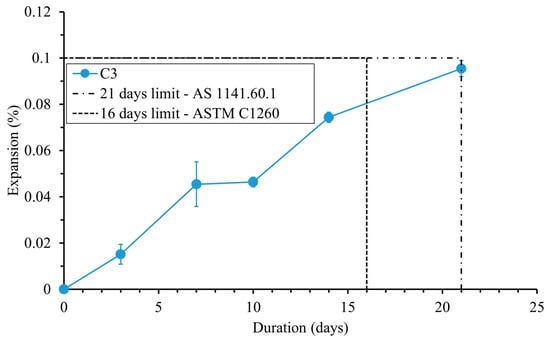 The expansion of the mortar bars caused by the ASR in the AMBT is presented in Figure 11. The expansion limits after 16 days and 21 days of exposure to NaOH 1 M solution at 80 °C, as defined by AS 1141.60.1 and ASTM C1260, respectively, are integrated in Figure 11. The expansion of GGBFS–FNS mortar bars due to the ASR was lower than the limits set by both AS 1141.60.1 and ASTM C1260. This indicates that the concrete C3 is non-reactive in terms of the risk of ASR-induced expansion. These findings are consistent with previous studies that have reported the non-reactivity of FNS aggregate in geopolymer materials [49].