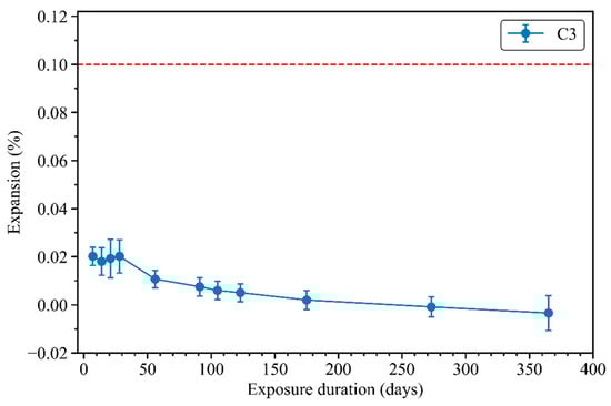 Figure 12 shows the length change of mix C3 mortar bars exposed to sodium sulphate solution (50 g/L) for up to 1 year, following ASTM C1012. The compressive strength of the C3 mortar reached 37 MPa after 1 day of casting, exceeding the compressive strength requirement of 20 MPa for immersion in the sodium sulphate solution, as described in ASTM C1012. During the first 30 days of immersion, the C3 mortar bars presented a slight expansion of 0.02%, followed by a gradual reduction of the mortar bars’ length. After 1 year immersed in the sodium sulphate solution, the length change became negative, indicating shrinkage of the mortar bars. While ASTM C1012 provides no expansion limit, Figure 12 incorporates the 0.1% limit after 12 months of immersion for high sulphate-resistant binders, as outlined in ASTM C595 [50]. The length change of the C3 mortar bars remained significantly lower than the 0.1% expansion limit for up to 1 year. In conclusion, this result reveals the dimensional stability of mix C3 when immersed in a sodium sulphate solution, qualifying C3 as a high sulphate-resistance mortar, according to ASTM C595.