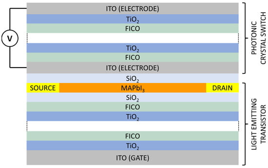 The photonic crystal below the MAPbI3 layer, made by TiO2 and FICO nanocrystals, functions as a gate dielectric. Instead, the photonic crystal above the MAPbI3 layer is made by TiO2 and FICO nanoparticle layers sandwiched between two transparent electrodes of ITO and functions as electro-optic switch.