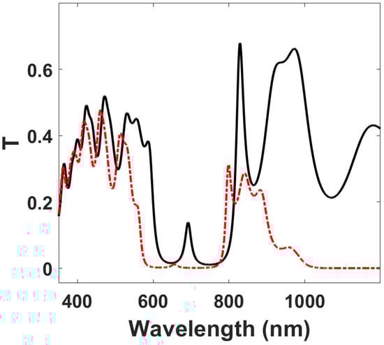 The application of an external voltage between the two ITO electrodes leads to a change in the carrier density of the doped semiconductor nanocrystals, i.e., FICO nanocrystals, resulting in a change in the dielectric function of the FICO nanoparticle layers and, thus, to a change in the effective refractive index of the photonic crystal. Such an effective refractive index change gives rise to a shift of the photonic band gap of the photonic crystal [,]. Referring to the structure sketched in Figure 1, the shift of the photonic band gap of the photonic crystal above the MAPbI3 layer results in a modification of the light transmission spectrum of the light-emitting transistor coupled with the microcavity. In Figure 2, the transmission spectrum of the light-emitting transistor coupled with the microcavity is shown for two different carrier densities of the FICO nanocrystals: the solid black curve corresponds to the structure with a FICO carrier density of 1.68 × 1027 charges/m3, while the dotted/dashed red curve corresponds to a FICO carrier density of 3.68 × 1027 charges/m3.