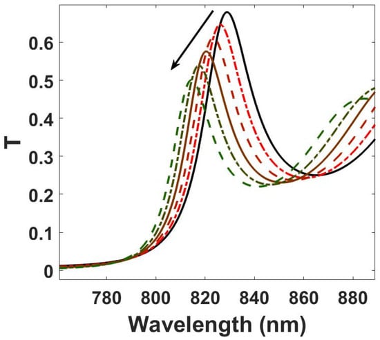 With such a change in carrier density of FICO nanocrystals, it is possible to almost completely suppress the defect mode of the microcavity. This is mainly due to the asymmetry generated between the two photonic crystals of the microcavities, i.e., the one below the MAPbI3 layer and the one above the MAPbI3 layer. To highlight the possibility of tuning the defect mode of the microcavity, in Figure 3, the transmission spectrum of the light-emitting transistor coupled with the microcavity is shown for six different carrier densities of the FICO nanocrystals: 1.68 × 1027 charges/m3 (solid black curve), 1.88 × 1027 charges/m3 (dotted/dashed red curve), 2.08 × 1027 charges/m3 (dashed dark red curve), 2.28 × 1027 charges/m3 (solid brown curve), 2.48 × 1027 charges/m3 (dotted/dashed dark green curve), and 2.68 × 1027 charges/m3 (dashed green curve). The arrow in the figure highlights the increase in carrier density.
