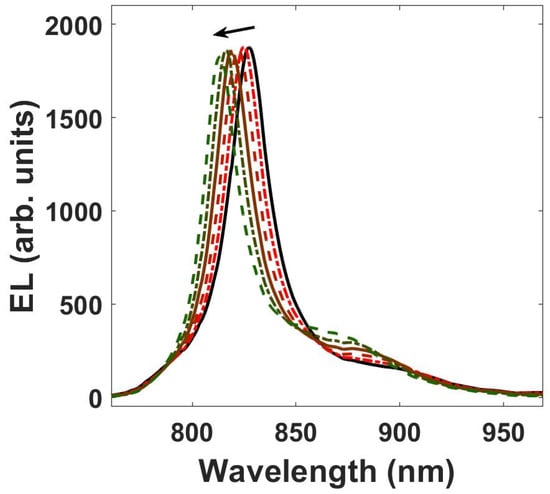 A shift of about 20 nm is shown. With a simple linear fit, it is possible to determine that 7.2 × 1025 charges/m3 are needed for a shift of 1 nm of the defect mode. In a similar photonic structure, i.e., a photonic crystal made with indium tin oxide and titanium dioxide layers, a shift of 23 nm has been achieved with an external voltage of 10 V []. Considering the electroluminescence (EL) of a light-emitting transistor based on MAPbI3 (the experimental data were taken from Ref. []), it is possible to finely tune the EL by changing the FICO nanocrystal carrier density (Figure 4). As in Figure 3, the arrow underlines the increase in carrier density. Taking into account the aforementioned result for a similar photonic structure reported in Ref. [], the EL shift (in nm) over the external voltage (in V) can be estimated for this transistor and the value is about 2 nm/V.