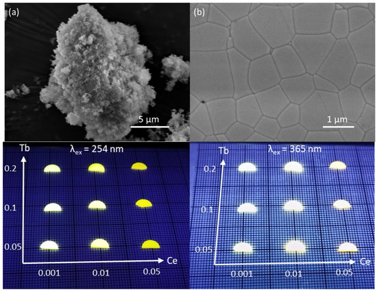 SEM images of representative precursor of (Gd,Y,Tb,Ce)3Al2Ga3O12 (a) and ceramics (Gd0.372Y0.558Tb0.067Ce0.016)3Al2Ga3O12 (b) and samples under UV excitation of different wavelengths (bottom panels).