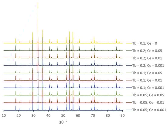 X-ray diffraction pattern of GYAGG:Tb,Ce ceramics samples with different terbium and cerium concentrations.