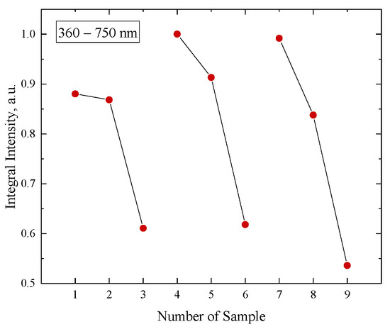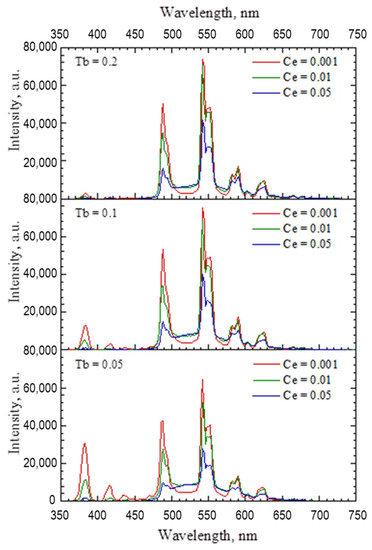 A comparison of their integrated intensities in the spectral range of 360–750 nm is shown in Figure 4. The points with the same concentration of Tb are connected by straight lines on the plots of the dependence of the integral intensities for better perception. As seen, it is not advisable to increase the concentration of terbium more than x = 0.2, and the optimum concentration in terms of light output is close to x = 0.1.
