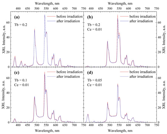A comparison of the XRL spectra of samples without Ce (a) and representative samples with an optimal Ce content and in the Tb concentration range (b–d) before and after irradiation with a 10 MeV electron beam.